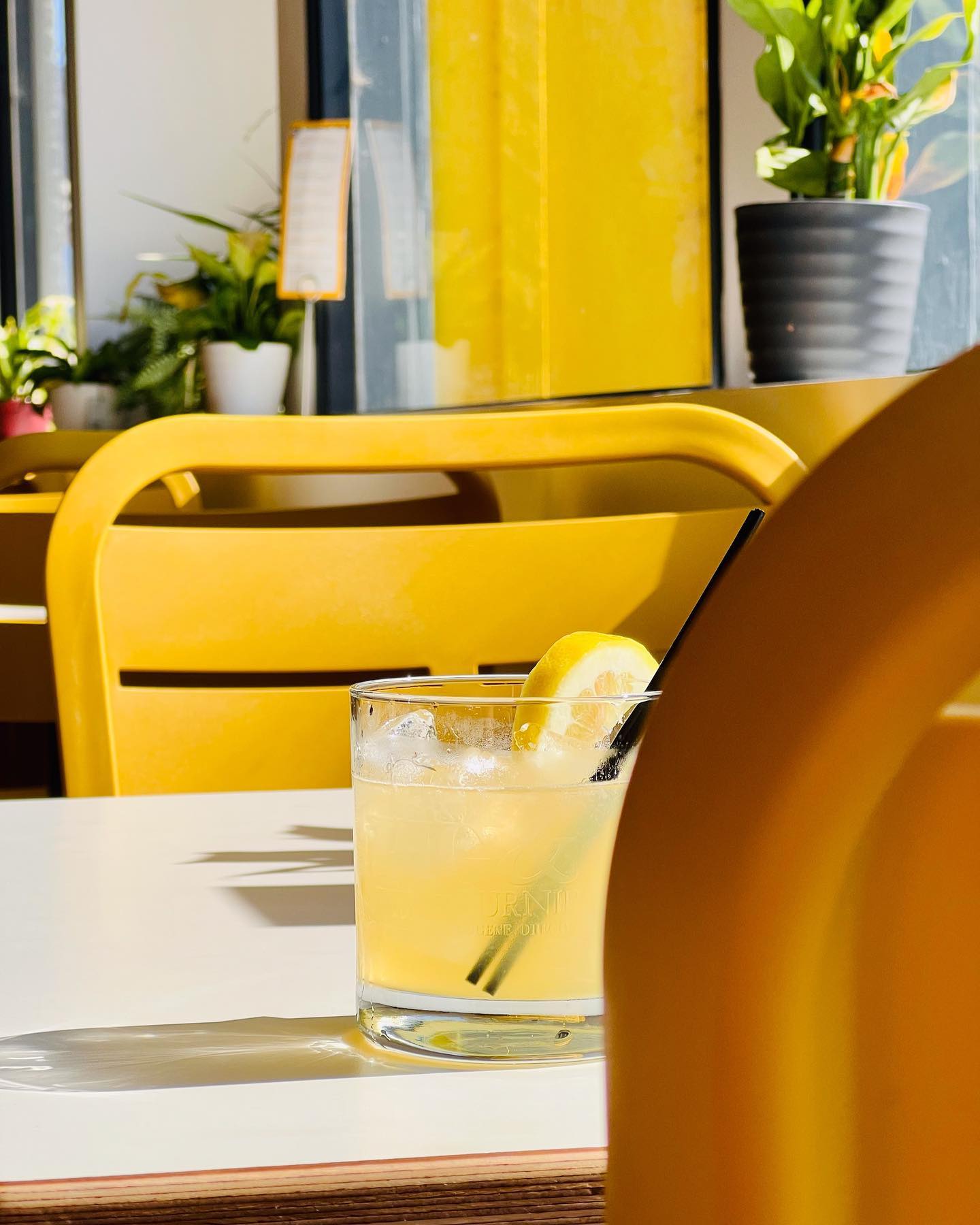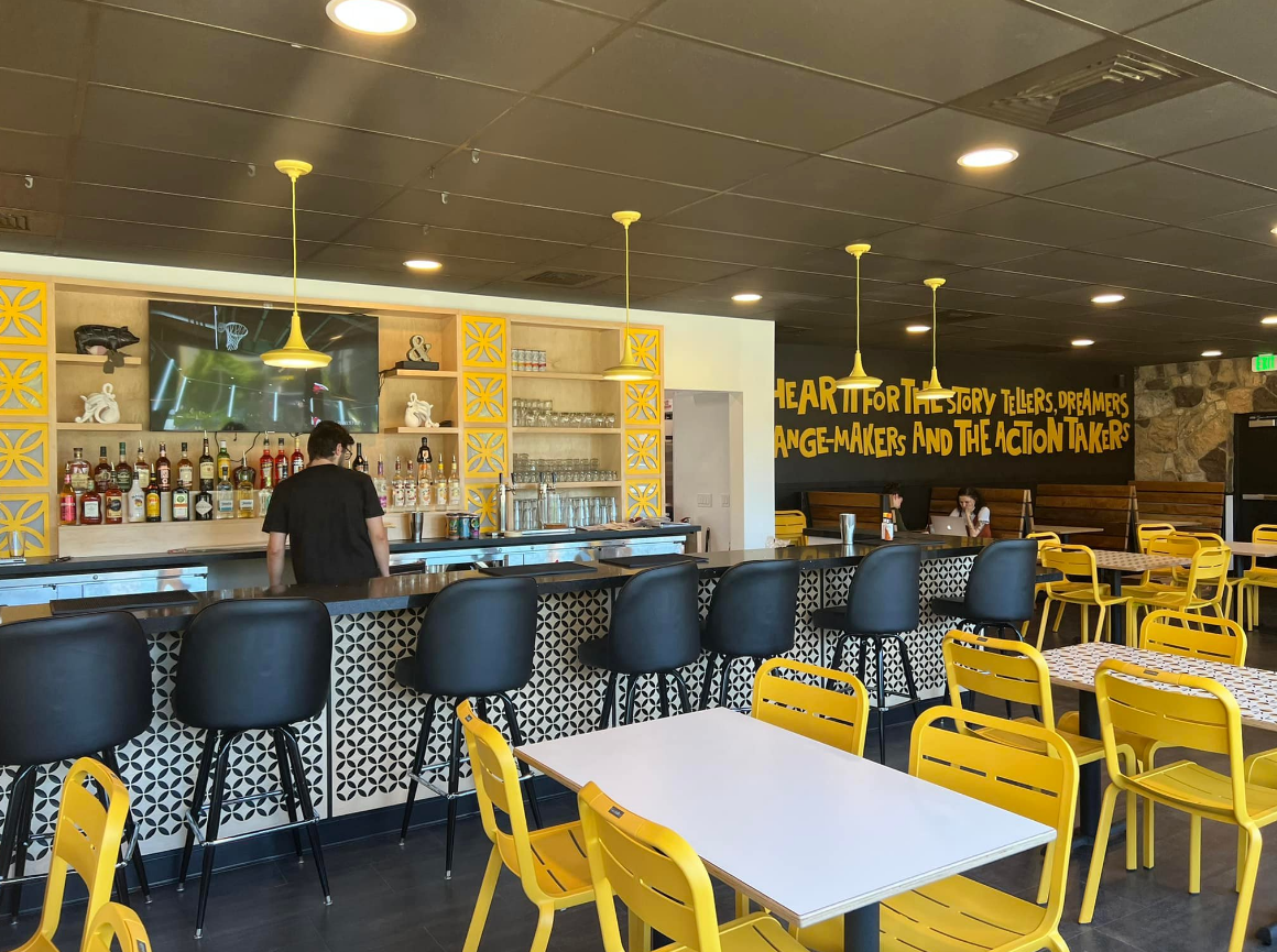 The interior design blends rustic beech wood elements and industrialized metals with modern materials and warm saffron yellow tones. Unique design features like laser cinder block columns with back-lit frosted panels in the bar and an abstract turnip logo displayed in the custom laminate as part of the tabletop design, create confidence that guests will experience something more than the ordinary dining experience here.